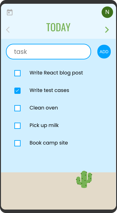 Complete a task and a cute cactus appears in the sand. The cactus image comes from Twitter’s open source emojis project